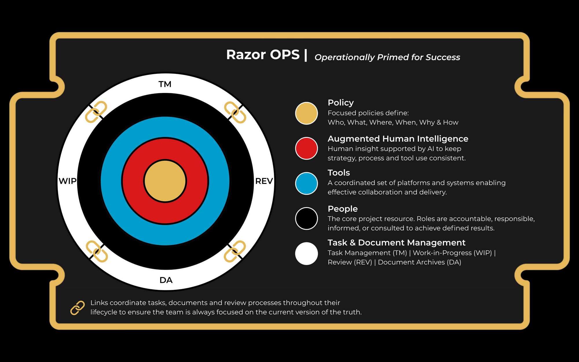 - Policy sits at the core. Precise, well-structured definitions of the who, what, where, when, why, and how for each task and deliverable. It provides consistent guidance across the entire project lifecycle.