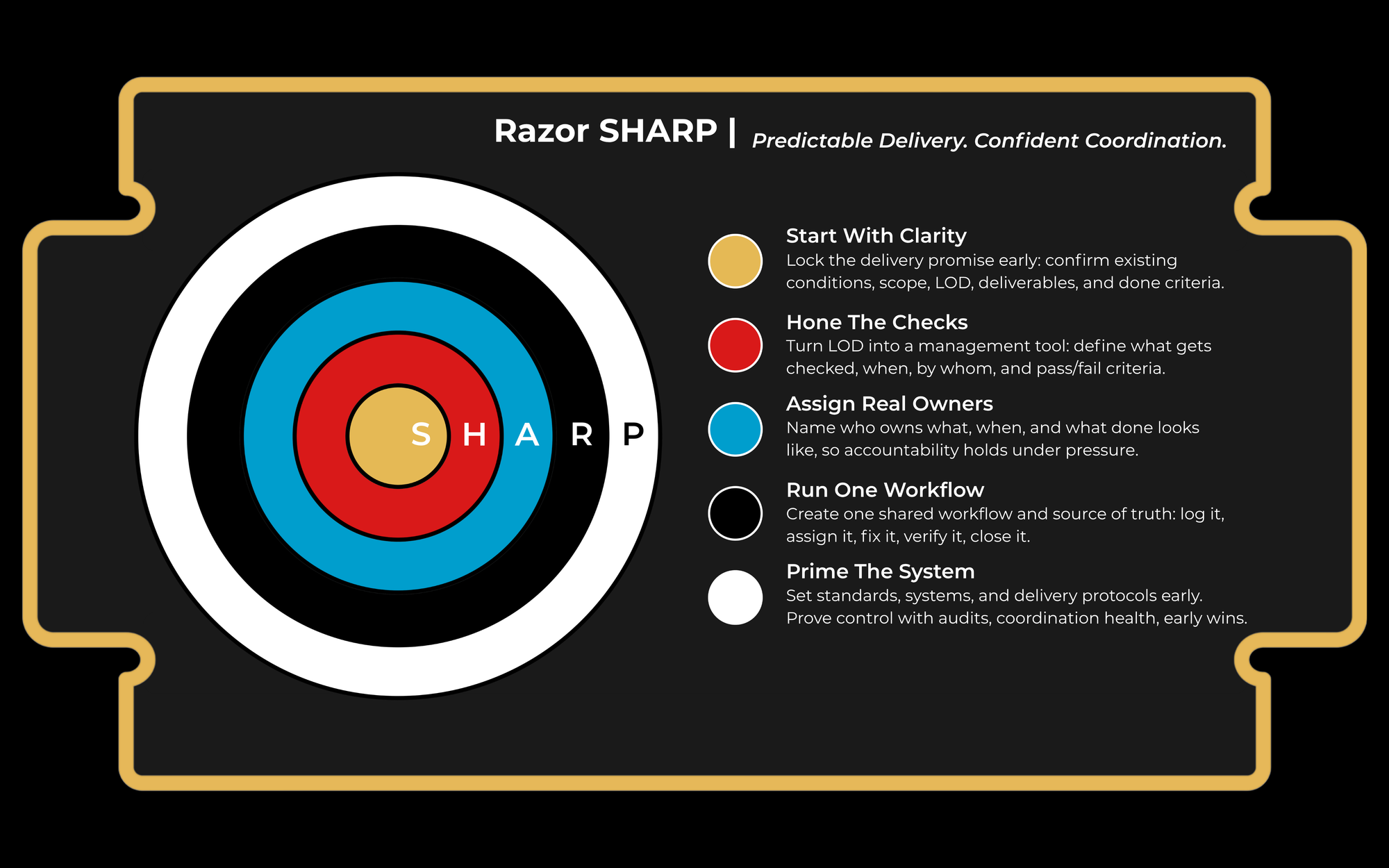 Razor SHARP runs the job. Five principles that prepare each project for success and track its health from start to finish. It's the discipline that turns a good operating system into a predictable project outcome.